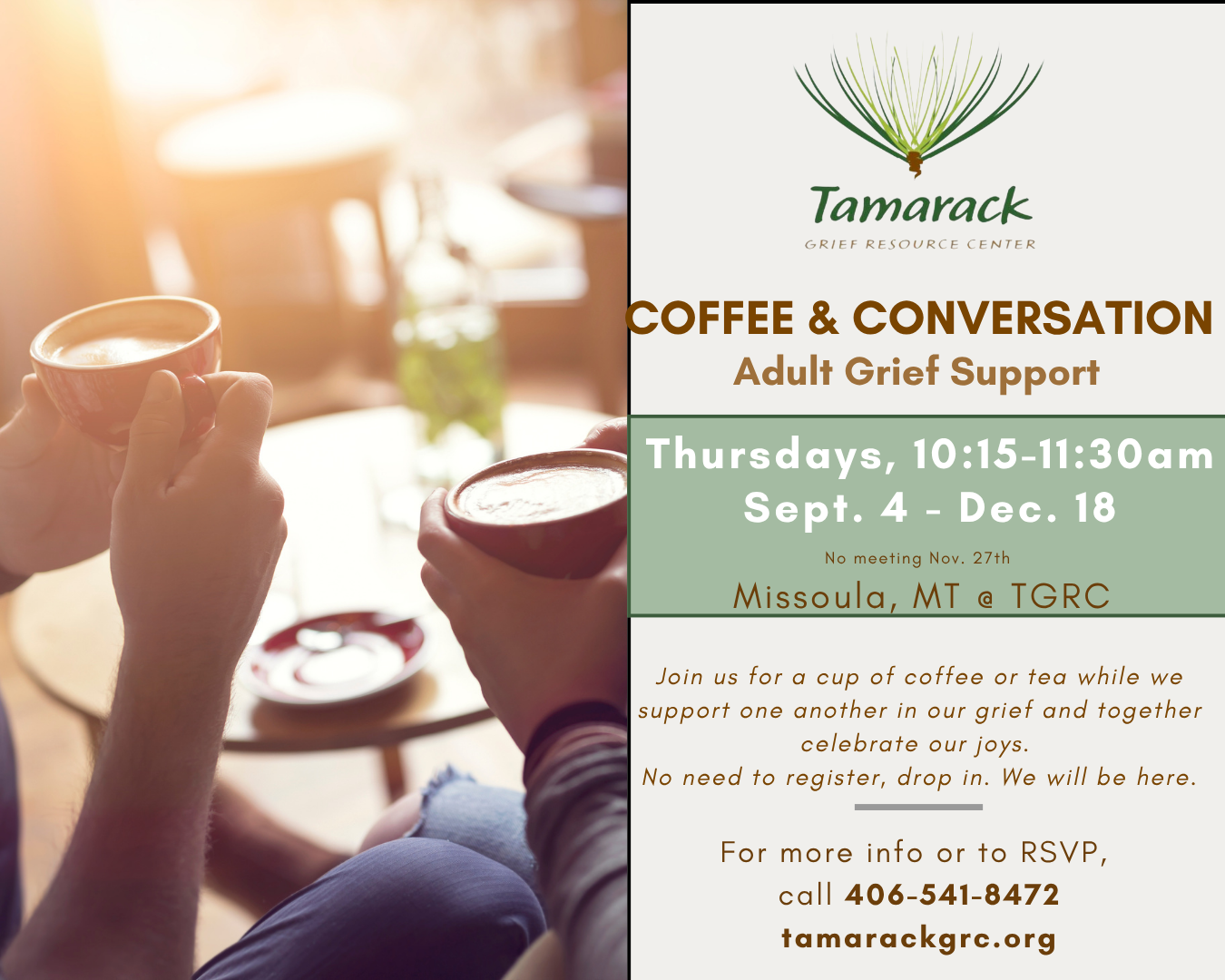 Join us for a cup of coffee or tea while we support one another in our grief and together celebrate our joys. This group is for bereaved individuals. For more information, call us at 406-541-8472.